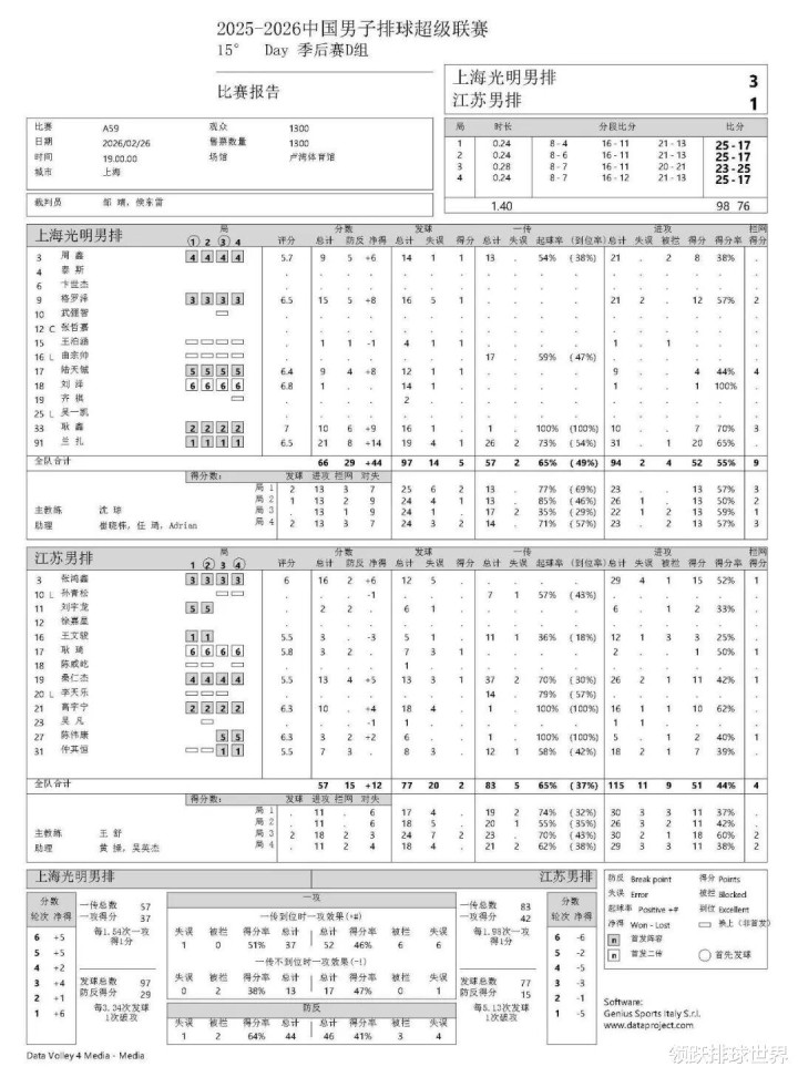 近日,2025-2026赛季中国男子排球超级联赛A级季后赛第十五轮在上海打响,上海光明男排坐镇主场迎战江苏男排,经过四局较量,上海队以3-1力克对手,四局比分为:25-17、25-17、23-25、25-17,顺利拿下季后赛开门红,为后续征程奠定了坚实基础。
